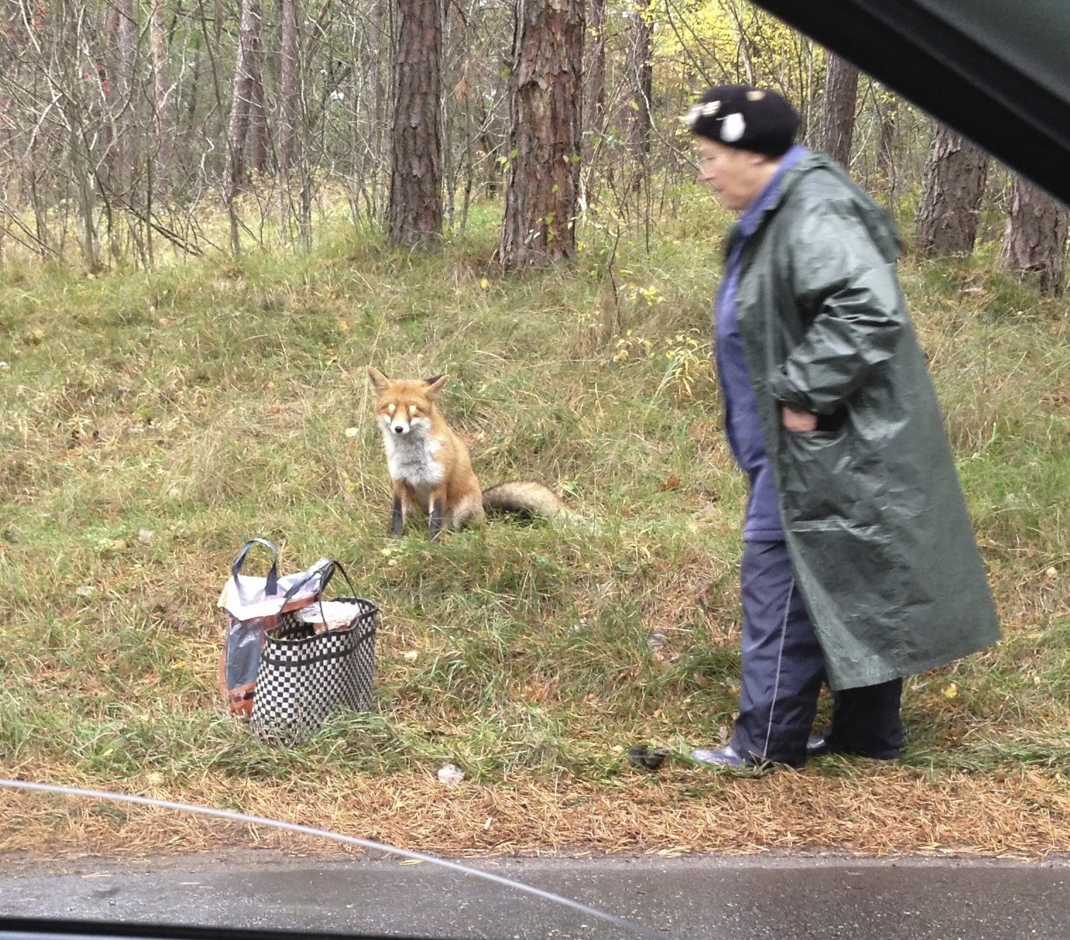 A short distance ahead another car had stopped. There a mushroom picker was preparing to feed a red fox that had come by for a handout.