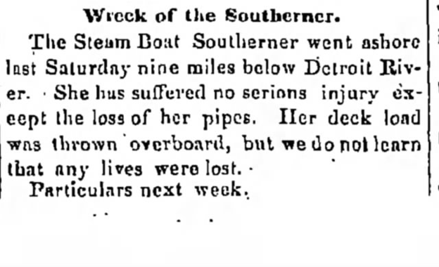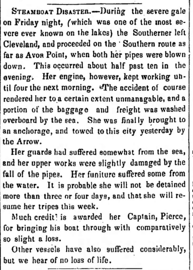 The Southerner was repaired and back in service ten-days later. Its 35-year-old Captain, L.A. Pierce, was commended for his courage and skill in saving the ship. A Vermonter who had come west with the arrival of steam navigation on the Great Lakes, Pierce became a Democratic Party leader in Cleveland. In 1855 he was promoted to general agent for the Cleveland and Detroit line, an affiliate of the Michigan Central railroad. He died in 1881.