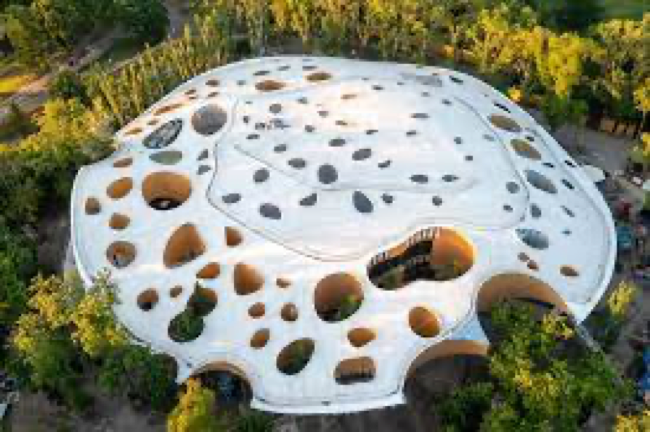 An aerial photo provided by the Varosliget Project reveals the many perforations in the roof, the golden shafts that bring natural light into the building.