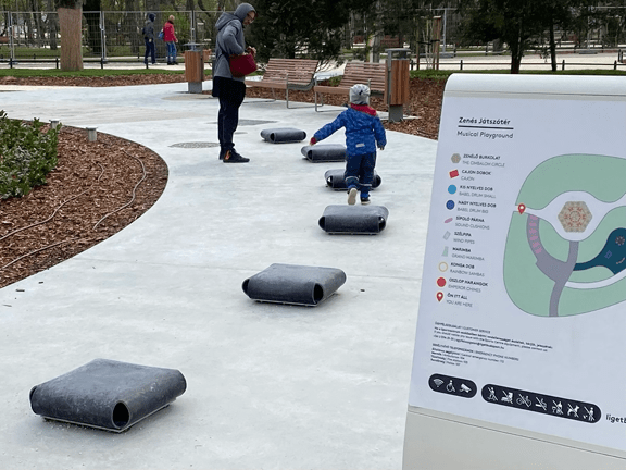 The musical theme continues outside where there is a small amphitheater and playground where six bean bags emit different sounds when jumped upon by children.